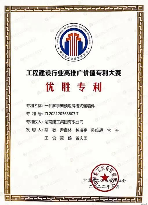 7月29日-30日,在中國施工企業管理協會召開的“2022年工程建設行業科技工作會議暨科技成果競賽交流會”開幕式上,金年会總承包公司推選的《一種腳手架預埋滑槽式連牆件》獲評第二屆工程建設行業高推廣價值專利大賽“優勝專利”獎。該技術已在2020年獲得省級工法、2021年獲得國家實用新型專利授權。